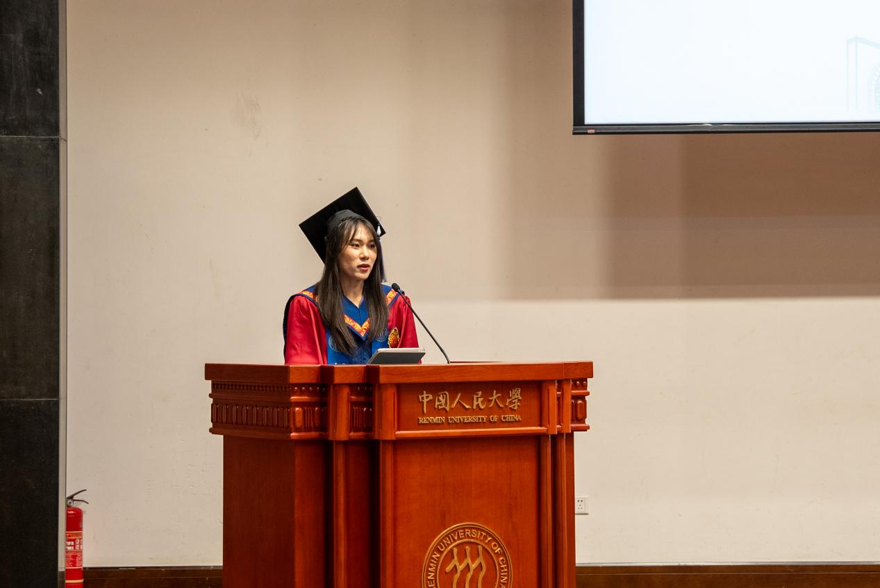 北京市级优秀毕业生2022级汉语国际教育硕士1班学生代表杨卓用最朴实的语言,讲述了从苏州校区开学至今的成长印记。春日教室的第一次见面,夏夜荷塘边的葫芦丝悠扬,红旗下庄严宣誓的那一刻,以及小组讨论时迸发的思想火花,每一个瞬间都见证了他的蜕变。在这里,他不仅夯实了专业功底,更从“强国先锋、复兴栋梁”的使命召唤中,汲取了无限动力。此刻,他心怀感恩,将最深的敬意献给悉心教导的老师和孕育梦想的母校;未来,他将继续以“人大人”的身份,把中国文化的魅力带向世界。