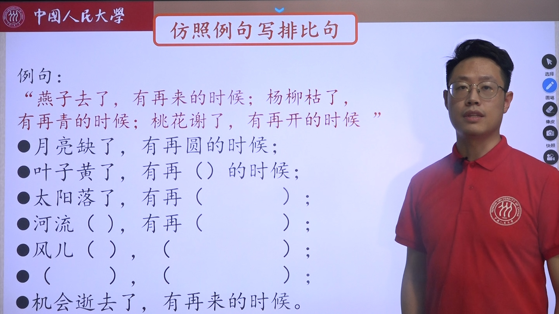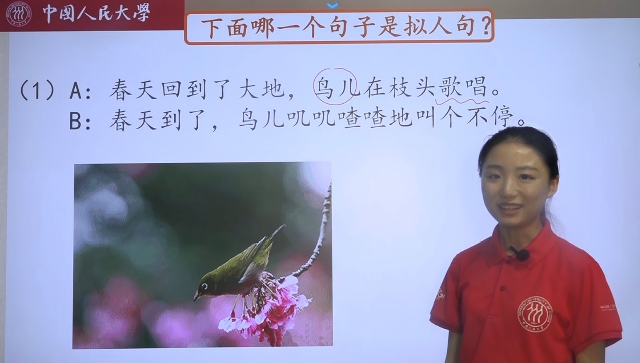自开赛以来,参赛团队在章欣老师的引领下积极拓宽教学思路,力求创新教学方法,设计完成了作品《跟着诗人游四季》高级写作拓展课程,课程全系列以四季变换为主线,从应景古诗切入,讲解写作技巧及修辞手法。同时,针对留学生因文化差异而较难理解的内容,该课程做适当讲解,使学生在情景中习得写景的技巧,感知中华文化的魅力。团队结合参赛要求和自身特点,将汉语教学和智慧课堂系统深度融合,着力展现人大汉硕学生教学水平与风采。团队作品因创意新、教态好、讲解深入浅出、制作精良,且具备较强的趣味性及启发性,获得了评委老师的一致好评——“充分体现了微课‘小而精’的特色,实属高级汉语精品课程”。